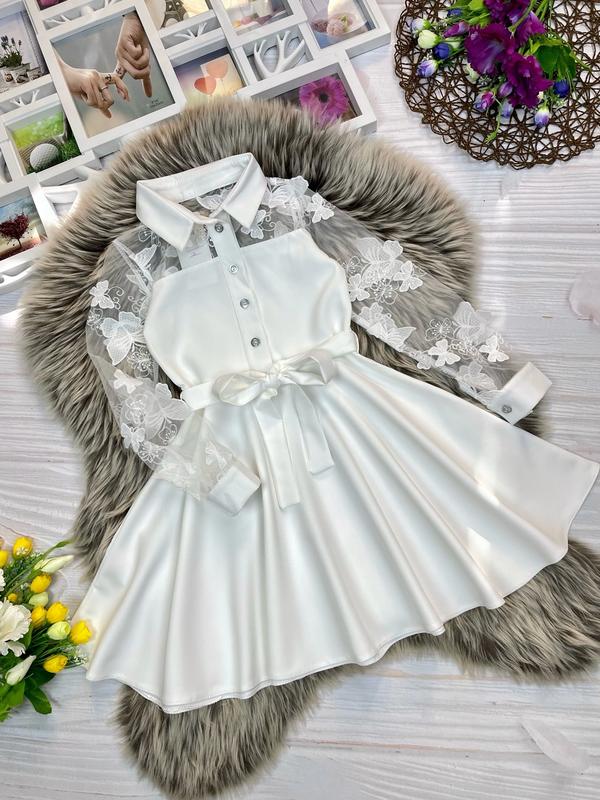 Ніжна і нарядна сукня для дівчаток Тканина костюмка + рукав 3-D кружево спереду застібається на гудзики, зав'язується під поясок Заміри: довжина/пог/рукав від плеча 122 - 61/32/43 128 - 68/32/46 134 - 70/33/48 140 - 73/35/49 артsanya