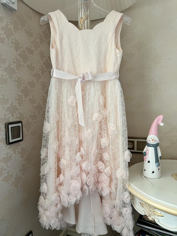 Платье в состоянии нового, одето один раз в фотосессию. Размер соответствует 8-10 лет, до 140 см. Замеры: Ширина в талії 33 Довжина від пояса 48 (спереду) – 73 (позаду) Висота корсета 20 (по лінії вирізу попереду) та від плеча 28 см. Нежно персиковый цвет, лиф платья из кружева, на подкладке. Юбка фатиновая с аппликациями в виде роз. К платью есть розовые балетки (см. в своих обьевах).