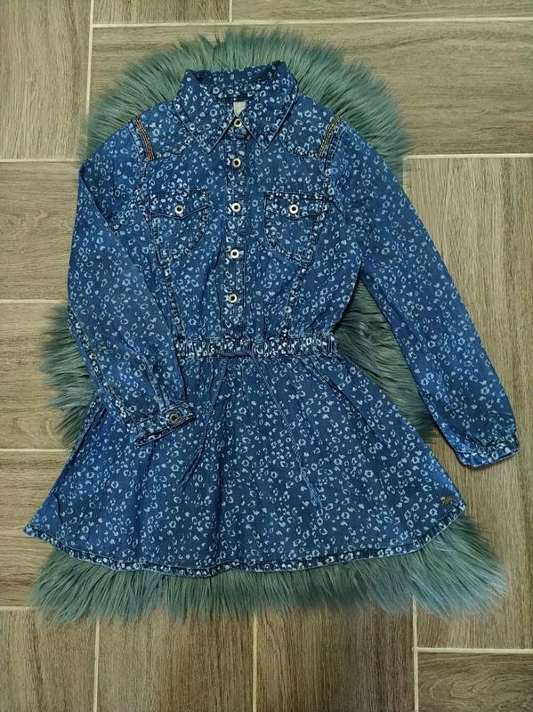 Стильное джинсовое платье для девочки 5-6 лет в отличном состоянии. Длина-55 см, под ручками-34 см,рукав от плеча-42 см, от горловины-50 см.