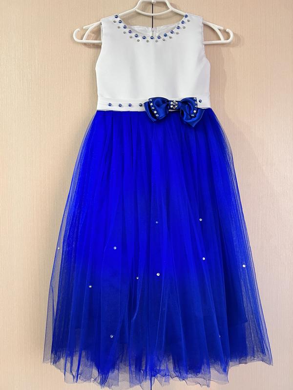 Платье бальное на выпускной в садик, или другой праздник. 4-6 лет. Платье одевалось один раз на выпускной в садик. К платью идут перчатки. А также, если вам нужно, могу подарить заколку для волос, которую я сама сделала под цвета платья. Длина от плеча до низа - 92 Длина белой части от плеча до пояса-25 Объем грудины- 64 Плечи-28