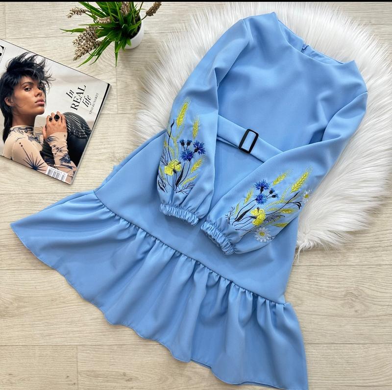Неймовірна сукня в стилі вишиванки 💙💛 Ніжна та вишукана 🥰🥰🥰 Рукавчики вишиті в патріотичному стилі 😍 Пишна спідничка 💃🏻 Обʼємні рукава, понизу на резиночці. Є поясок 😉 Позаду сукня застібається на блискавку 👌🏻 Тканина: костюмка барбі 👍🏻 Виробник: Україна 🇺🇦 ЗАМІРИ ⤵ +/- 1-2см!!! р.146-довжина від плеча 74 см/ПОГ 40 см/рукав від плечового шва 46 см