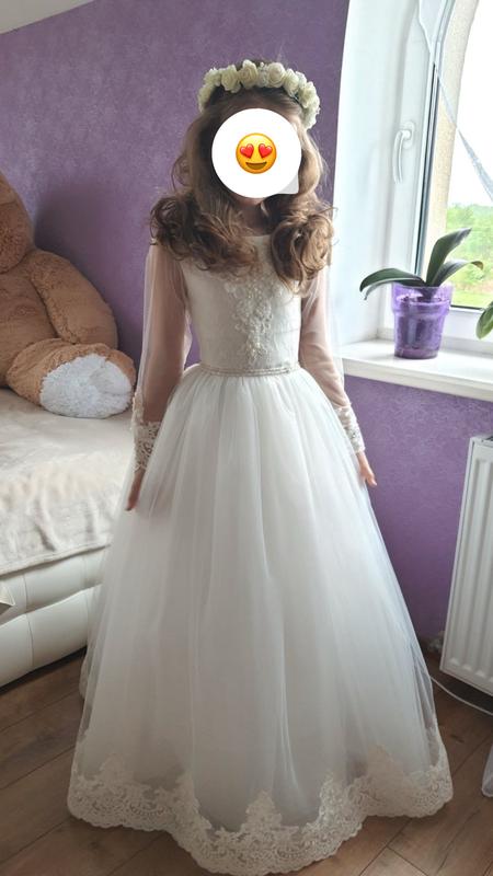 Була у використанні один раз заміри: довжина 123 см (від найвищої точки сукні донизу) по талії 33 см рукав: 48 см Кого цікавить - пишіть зроблю додаткові заміри і надішлю більше фото/відео Віночок та кільце для розширення сукні в комплекті в подарунок