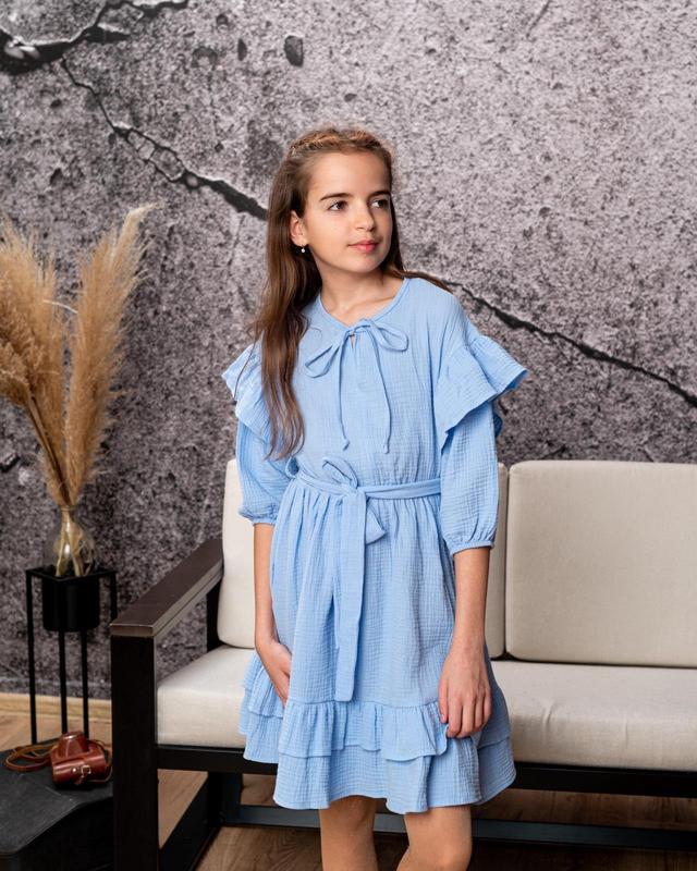 Нежное платье для модницы невероятной красоты ткань муслин с пышными воланами в талии под резинку и поясок РЕКОМЕНДУЮ! длина/пог/рукав от плеча (3/4) 128р-67/36/34 134р-70/37/35 140р-72/39/37 146р-74/40/40 152р-77/42/43 +-2 см артgirl