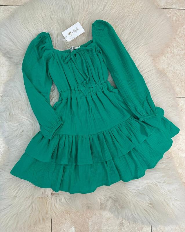 Стильна та ніжна сукня для дівчат. М'яка, легка та приємна до тіла. Пояс на широкій резинці. Тканина - муслін (натуральна) Заміри: 134 довжина від плеча - 69см, напівобхват грудей - 30см, рукав від плеча - 49см. Мс