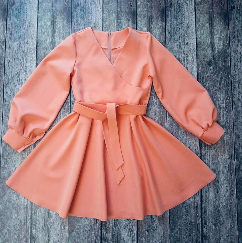 Стильное платье для модниц По спинке к поясу застегивается на молнию. Спереду на запах. Пояс в комплекте. Тканина- костюмна. Замеры: 140 длина - 69см, рукав от плеча - 52см, полуобхват груди - 38см 164 длина - 87см, рукав ид плеча - 63см, полуобхват груди - 45см Мс