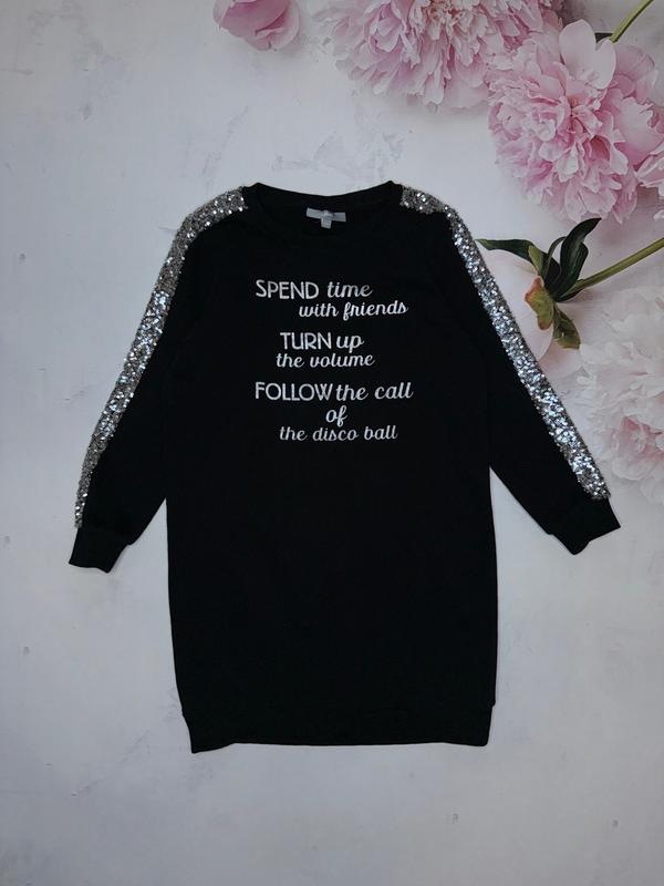 Платье чёрного цвета Внутри на баечке, рукав украшен пайетками. Состояние супер 🏷️JBC 9 лет/134 Длина 69. ПОГ 43. Рукав 44