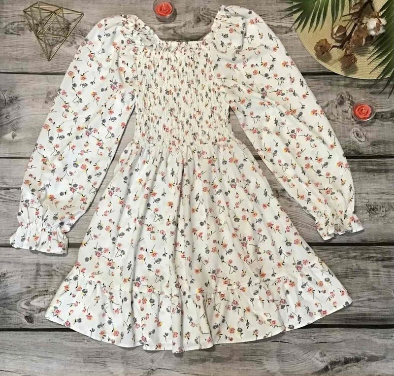 Мила сукня для дівчат. Тканина - софт, гарної якості. Верня частина сукні зібрана, гарно тянеться. Заміри: 140 довжина - 68см, напівобхват грудей - 23см, рукав- 57см.