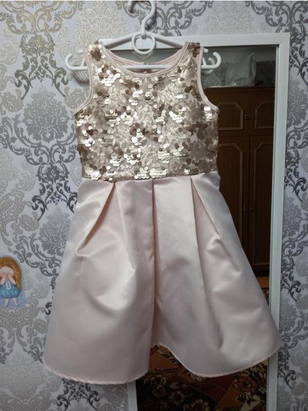 Шикарное платье нежного розово-персикового цвета, верх украшен пайетками, талия регулируется поясом, есть подкладка. Замеры на фото