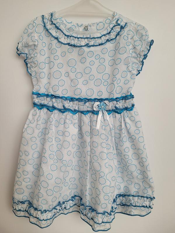 Легка літня сукня для дівчинки з бавовни (батист). Позаду сукні кнопочки та поясок, завдяки якому можна регулювати її об'єм. Розмір: 56 (ріст 92-98 см), довжина сукні 45 см.