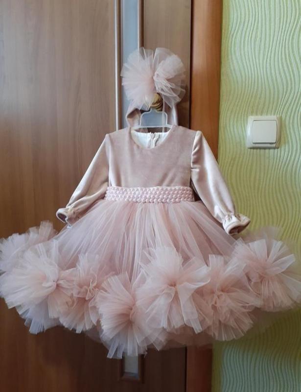 Пудровое детское нарядное платье для девочки с помпонами от 1 годика и больше