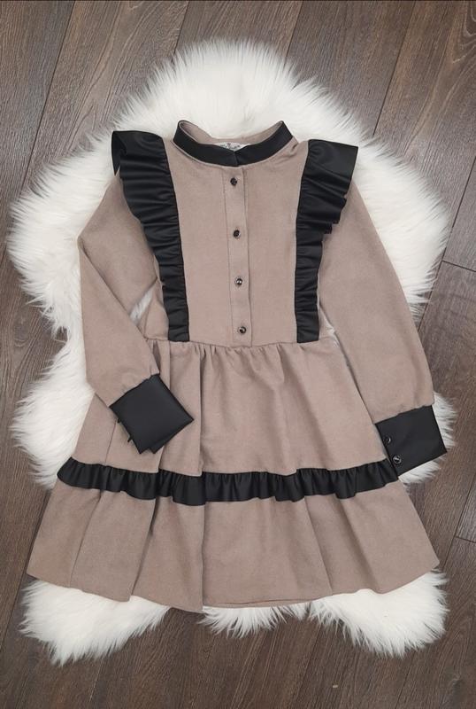 Стильное платье выполненное замшдиагональ в сочетании с эко кожей. Украшена рюшей, кофевчик манжет кожа. замеры: длина/рукав/пог 134-70/51/32 140-75/52/33 146-79/53/34 158-88/57/36 +-2см