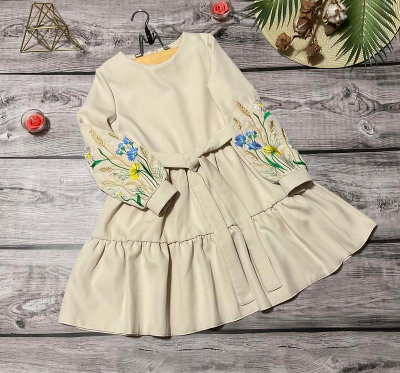 Невероятно красивое и нежное платье На рукавах ВИШИВКА!, не малюнок. По спинке застегивается на молнию. Пояс в комплекті. Ткань - костюмка барби. Замеры: 128 длина-69см, полуобхват груди - 33см, рукав - 45см. 146 длина-76см, полуобхват груди - 37см, рукав - 52см.