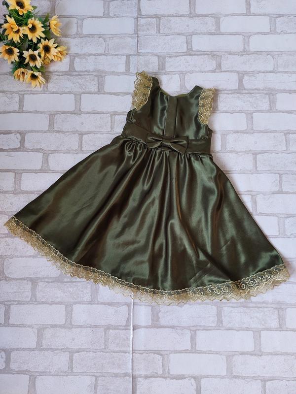 Нарядное платье на девочку зеленое цвета хаки новое ручная работа (Handmade) Размер 3-4 года, рост 98-104 см Замеры: длина 63 см полуобхат груди 29 см полуобхат талии 28 см цвет- зеленый, хаки материал - верх атлас; подкладка - полиэстер.