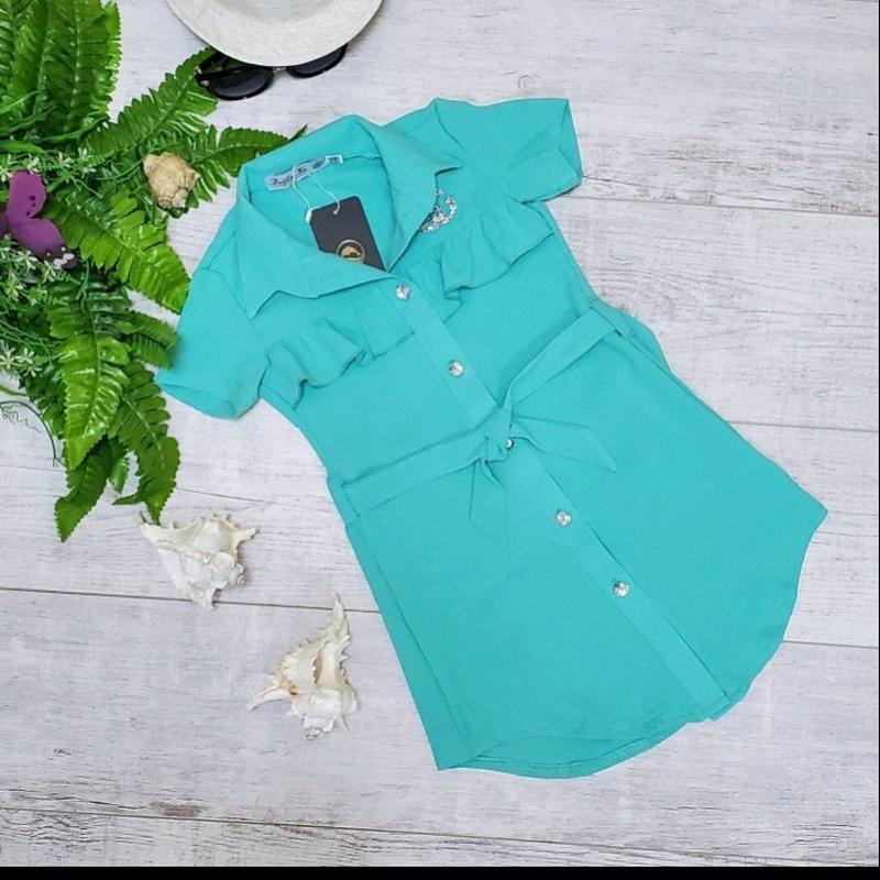 Платье-рубашка насыщенного бирюзового цвета, приятная к телу ткань: очень легкая и мягкая. По наборке идет на 146, однако будет идеально для тех, кто носит 140.