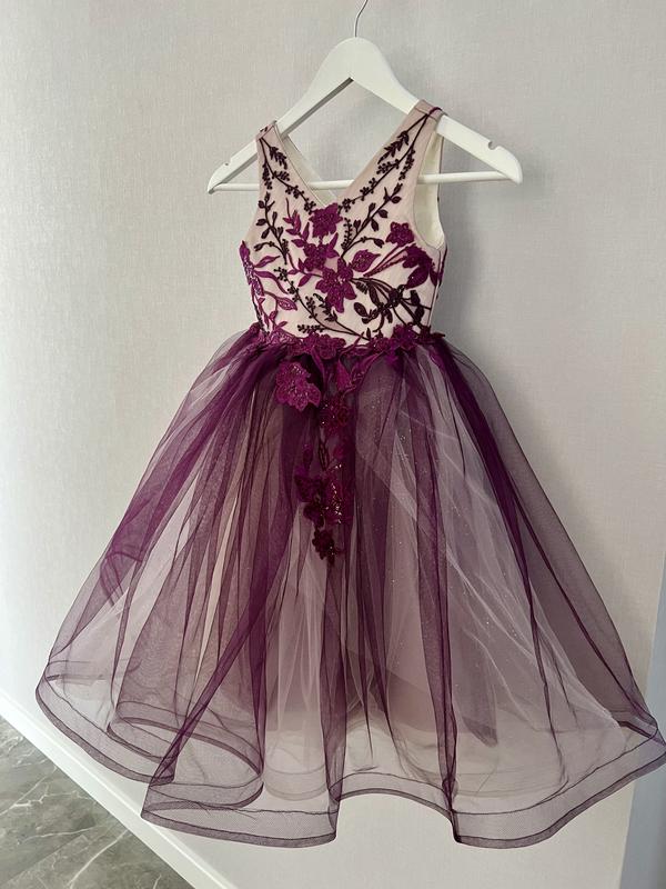 Неймовірно красива сукня для Вашої принцеси! Підійде на 6-7 років, але орієнтуйтеся по замірах. Довжина - 79 см, ПГ - 30 см, ПТ - 27 см. Є невеликий, при носінні непомітний нюанс ( останні 2 фото).
