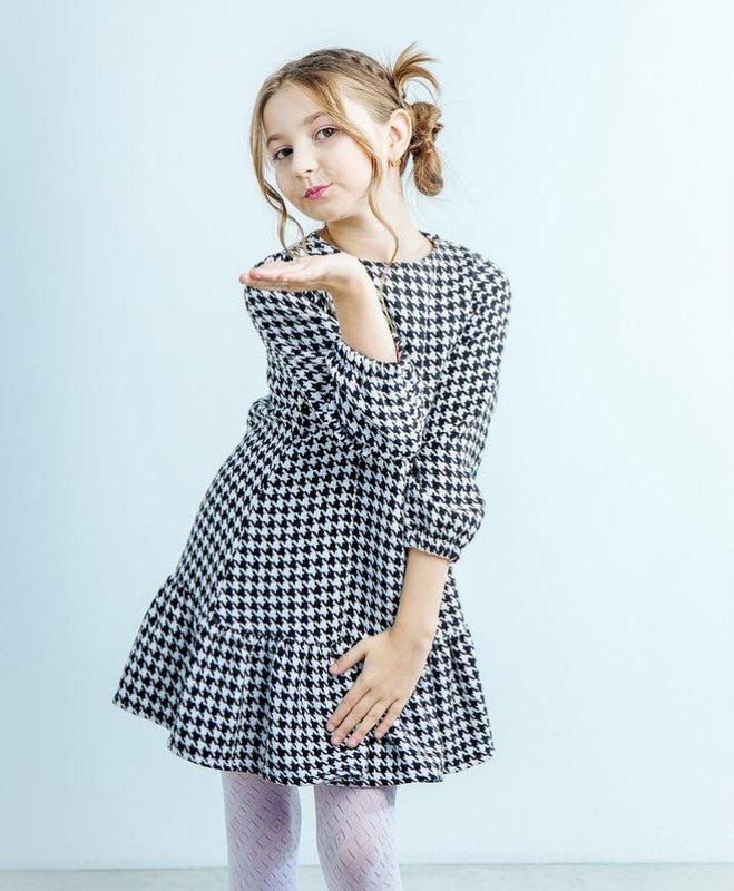 Стильна Сукня у "гусячу лапку" ткань:Твид костюмная ззаду на гудзики длинный рукав на резинке выглядит очень стильно, ткань приятная на ощупь, красиво стирается. все размеры в ассортименте 92,98,110,116,122,128,134,140,146,
