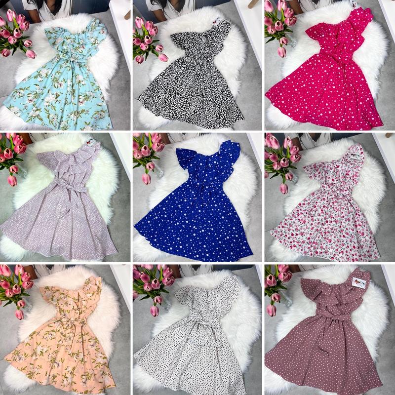 Воздушное летнее платье для принцессы, ткань супер софт, одно плечо спущенное, в талии есть резиночка, поясок в комплекте. длина/пог 134-73/33 140-75/36 146-8********** 158-82/39