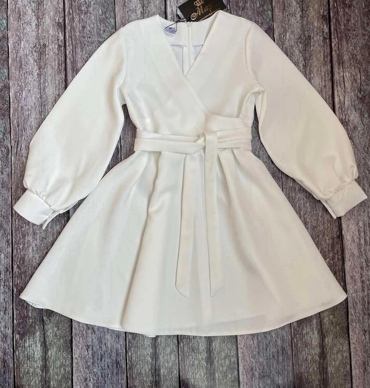 Стильна сукня для модниць По спинці до пояса застібається на блискавку. Спереду на запах. Пояск в комплекті. Тканина- костюмна. 158 довжина - 83см, рукав від плеча - 58см, напівобхват грудей - 44см 164 довжина - 87см, рукав від плеча - 63см, напівобхват грудей - 45см Розміри в наявності: МОЛОЧНИЙ: