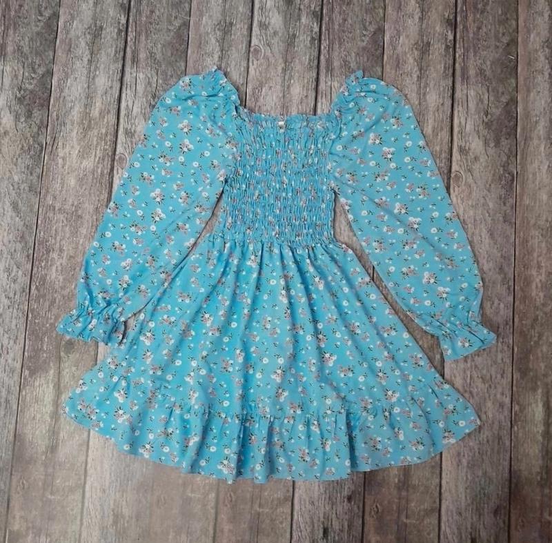 Мила сукня для дівчат. Тканина - софт, гарної якості. Верня частина сукні зібрана, гарно тянеться. Заміри: 140 довжина - 68см, напівобхват грудей - 23см, рукав- 57см. 146 довжина - 69см, напівобхват грудей - 23см, рукав - 59см. 152 довжина - 71см, напівобхват грудей - 24см, рукав - 61см.