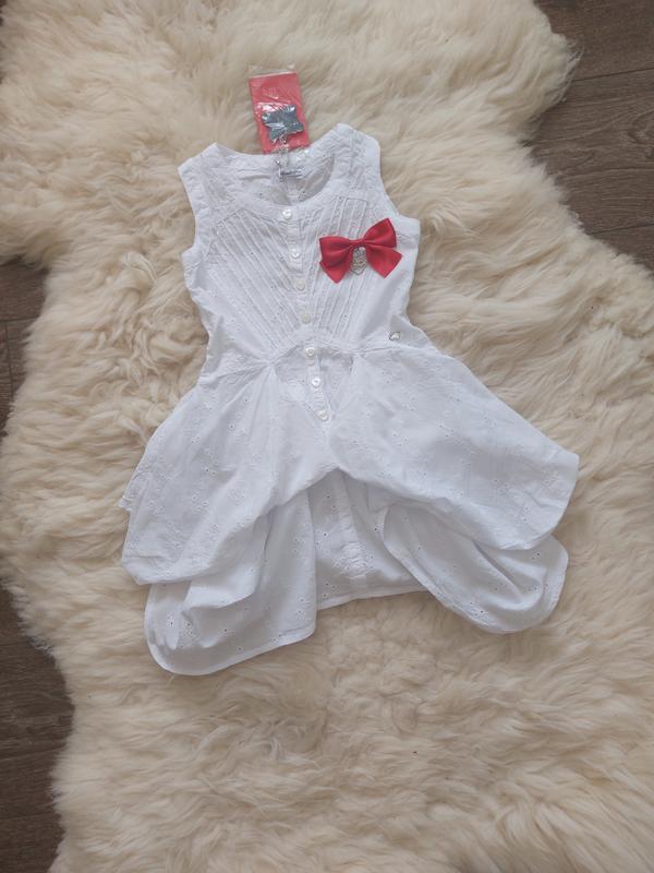 Классное платье интересного кроя от итальянского бренда детской одежды Fun & Fun. Застегивается на пуговицы. По наборке идет на 5 лет: ▪︎ длина по спинке - 49,5 см; ▪︎ НОГ - 28 см. Состав: 100% хлопок.