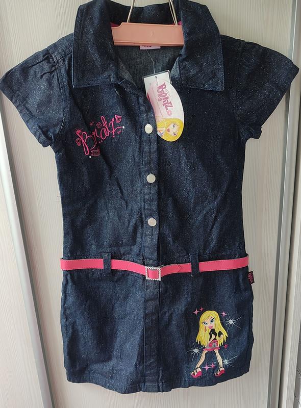Нове фірмове джинсове плаття Bratz. Темно-синій джинс із блискітками. Довжина 70 см Напів обхват грудей 36,5 см Зріст 140см