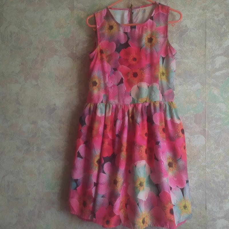 Красивое, яркое, праздничное платье в цветы в отличном состоянии. Ткань не тянется, есть подкладка. Длина -84см, пог-42см, пот-37см, сзади резинка, поб-свободно. Отправка после оплаты на карту