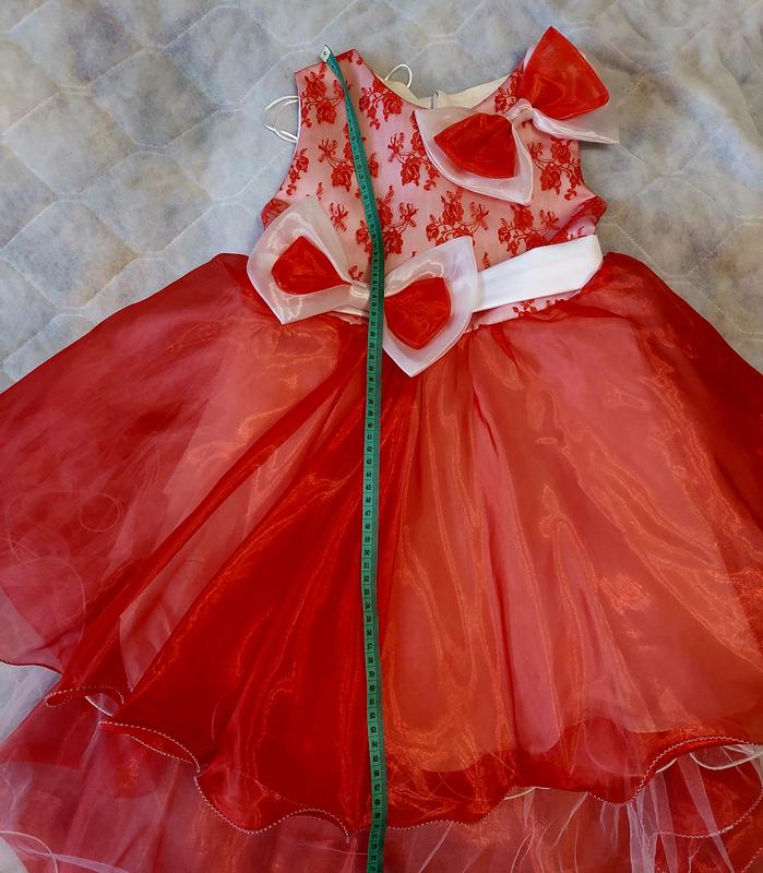 Ассиметричний пошив, позаду шлейф. На поясі та плечику два шикарниічераоно-білі банти. Верз прикрашений червоним гіпюром, бід ним білий шовк.Пишна юбка -шовк, фатин, верх. Сзаду фіксується корсетом.Неповторний оригінальний стиль. Одягалось один раз на День народження.