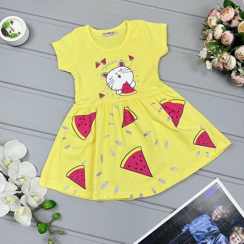 🦋Платье арбуз желтое с коротким рукавом. Рисунок-кат. Ткань двухнить Производитель Турция 📐Замеры: маломерки (92-98) - длж.44 / полуобхв. 23 (98-104) - длин.49 / полуобхв. 24 (110-116) - длин.50/ полуобхв. 25 (122-128) - длж.54 / полуобхв. 26