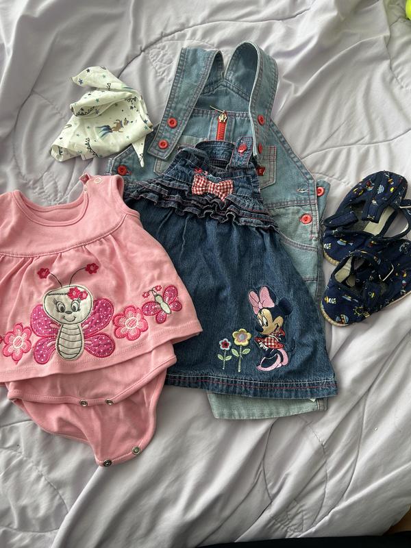 В лоте все что на фото По замерам мы носили от полугода до года,смотрите замеры Розовое платьице-само платьице-23 см,полная длина 33 см Джинсовый сарафанчик(тонкий джинс)-длина максимальная 35 см,регулируется пуговичкой на лямке Джинсовый комбинезон шорты (мягкий тонкий джинс) полная длина 52 см,тоже регулируется пуговичкой на лямке Тканевые тапули-13.5 см Новые,на липучке-очень мягкие и удобные Тоненькая косыночка (новая)в подарок к вещам