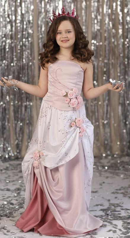 Изысканное, нежное дизайнерское платье которое состоит из корсета и юбки, юбка имеет подюпник на кольцах по желанию будет юбка более объемная. Платье рассчитано на 10-14 лет, корсет на дорогой объем т.к. имеет на спинке шнуровку, юбка в талии на резинке дает возможность надеть на стандартную, худи или полную девочку. Платье отлично подойдет для выпускного бала или торжественного праздника. Украшено платье розами и вышитым стеклярусом, состоит из трех видов тканей