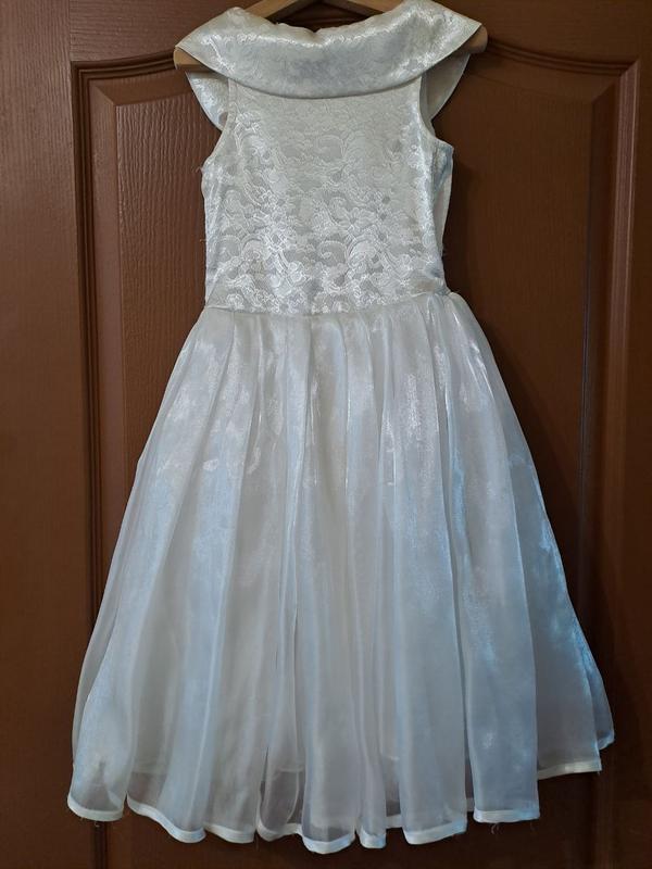 нарядное платье на возраст 5-6 лет. Очень красивое. Застегивается на молнию по спинке. Полуобхват груди - 30 см, длина по спинке - 40 см, длина юбки - 47 см. Есть небольшой ньюанс - небольшое повреждение нижнего края юбки, несколько см
