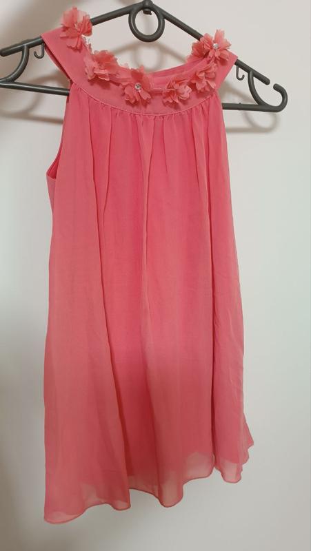 Платье в красивом состоянии, выполнено по типу сарафана - без рукавов. Застежка по горловине - пуговичка. Фасон трапеция. Горловина, обдувленная цветочками. Снизу подкладка полиэстер, сверху фатин. Размер 6Т. Замеры: Длина - 60 см Ширина - 35 см