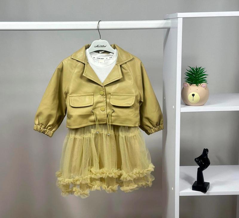 Костюм 2 в 1. Косуха + платье. Косуха:тек кожа, подклад - нейлон. Платье: трикотаж + фатин + ХБ подклад. Размеры пишу по бирке, смотрите замеры. 90см. - Куртка: довж.29см., шир. 32см., рукав от горловины 36см. Платье: длиннее.: 40см., шир. 22см., рукав от плеча 30см. 100см. - Куртка: довж.31см., шир. 34см., рукав от горловины 40см. Платье: длиннее: 48см., шир. 27см., рукав от плеча 34см. 110см. - Куртка: довж.34см., шир. 36см., рукав от горловины 42см. Платье: длиннее.: 52см., шир. 28см, рукав от плеча 35см. 120см. - Куртка: довж.35см., шир. 37см., рукав от горловины 45см. Платье: длиннее.: 57см., шир. 31см., рукав от плеча 37см. 130см. - Куртка: длин.37см., шир. 40см., рукав от горловины 48см. Платье: длиннее.: 58см., шир. 32см., рукав от плеча 40см. 140см. - Куртка: довж.39см., шир. 42см., рукав от горловины 50см. Платье: длиннее.: 65см., шир. 36см., рукав от плеча 42см. Замеряли 1 ростовку, допустимая погрешность 1-3см. (код 09)