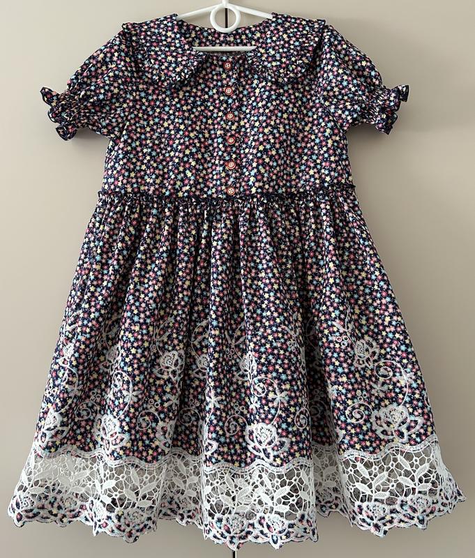 Дуже гарна сукня на дівчинку 6-7 років (100% бавовна) Довжина сукні -71 см, пог - 38 см, зверху до спідниці -28 см, довжина спідниці - 43 см, по плечах - 28см, плече - 6,5 см, довжина рукава від плеча - 17см.