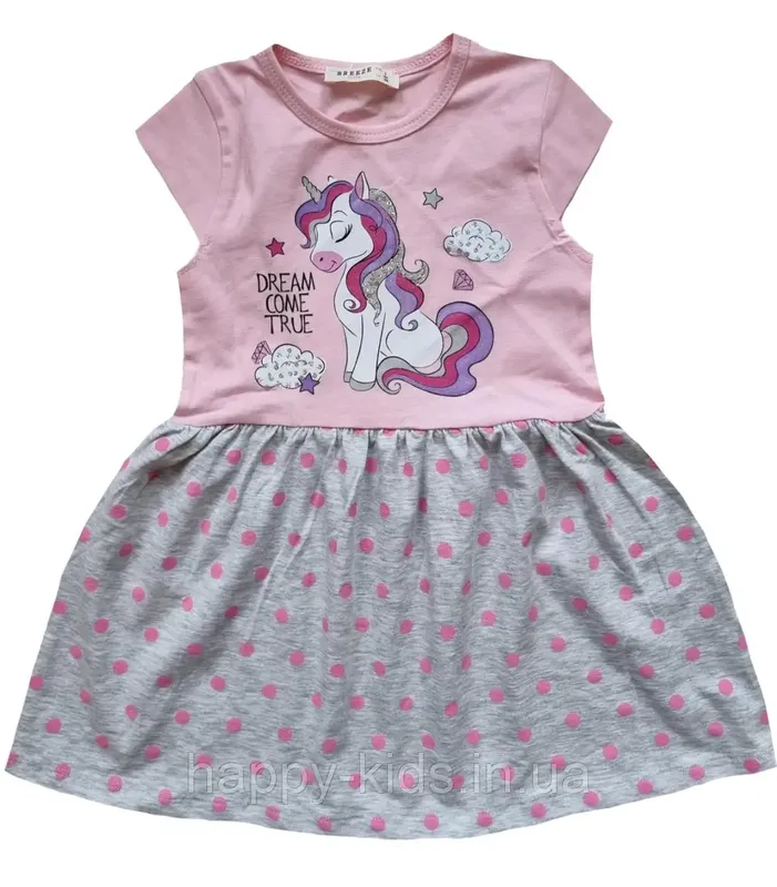 Летнее розовое платье для девочки отличного качества Произведено в Турции-Breeze Красивое летнее розовое платье для девочки пошито из мягкого, очень приятного на ощупь трикотажа, с небольшими рукавчиками Детское летнее платье спереди украшено ярким рисунком единорожки с блестками и пайетками. Юбка платья слегка расклешенная в горошек. Размеры в наличии 98, 104, 128см Замеры позволят по вымозе