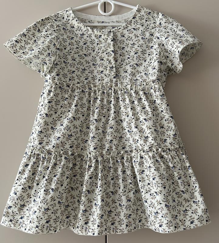Платье на девочку 4-5 лет. Материал - хлопок 100% молочного цвета в синий мелкий цветочек Длина платья - 58 см пог - 35 см сверху до юбки - 23 см длина юбки -35 см по плечах- 29 см длина рукава от плеча - 15 см (рукав - крыльце)