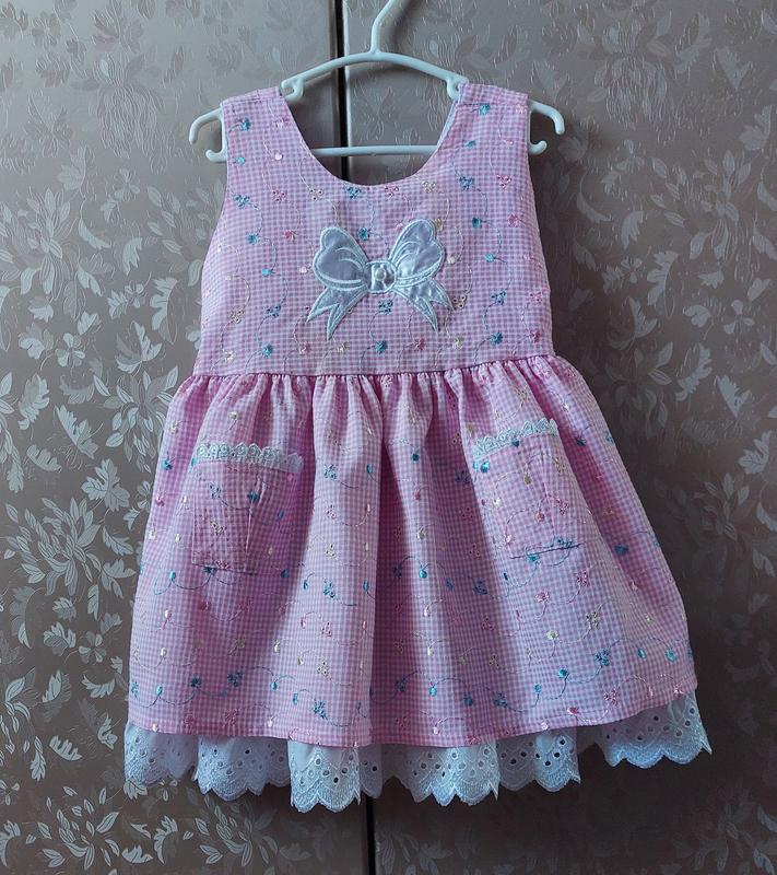 Дууже милое платье на девочку около 2-3 рочки, но лучше ориентироваться на рост ребеночка 92-98 см, потому что все детки разные. Платье розового цвета, спереди белый бантик. Сзади эффект поддетой кружной юбочки, что смотрится очень-очень красиво! На спинке V-образный вырез, что добавляет эффектности. На талии есть бантик. Спереди есть 2 карманчика украшенных кружевом. Снизу есть подкладочка с пришитым кружком, которое смотрится снизу. Платье супер милое! Фото не передает. Подойдет как на праздники, так и на каждый день в садик. Красиво смотрится как длинноньким, так и выше коленки, поэтому уверенно можно носить с 92 см до 104 см роста. Стирать можно в машинке, что очень важно. Состояние очень красивое. Купили за 570 грн, продаю за 200 грн.