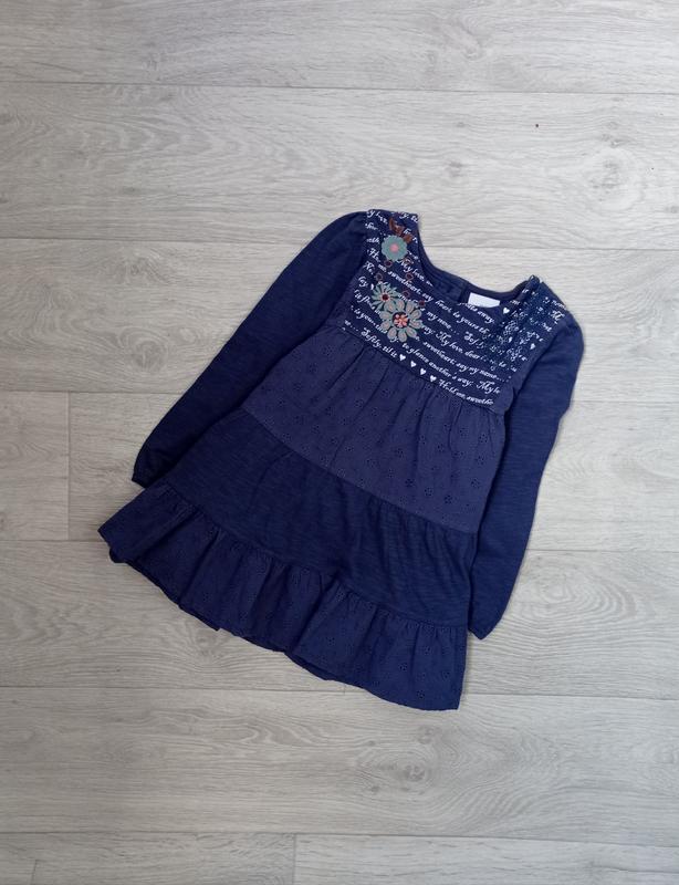 Свободное платье на 3-4 рюмки, рост 98-104 см Стан отличный. Украшено вышивкой цветов, пайетками и принтом надписи. Застегивается сзади на 4 пуговицы. Ткань прошва и трикотаж (100% хлопок). Пересылаю Укр-почтой, Новой почтой.