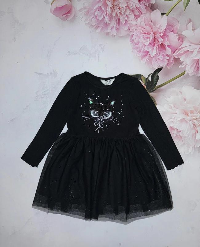Черное платье с котом Верх эластичный рубчик Состояние отличное 4-6 лет/110-116 Длина 60(26). ПОГ 34. Рукав 40
