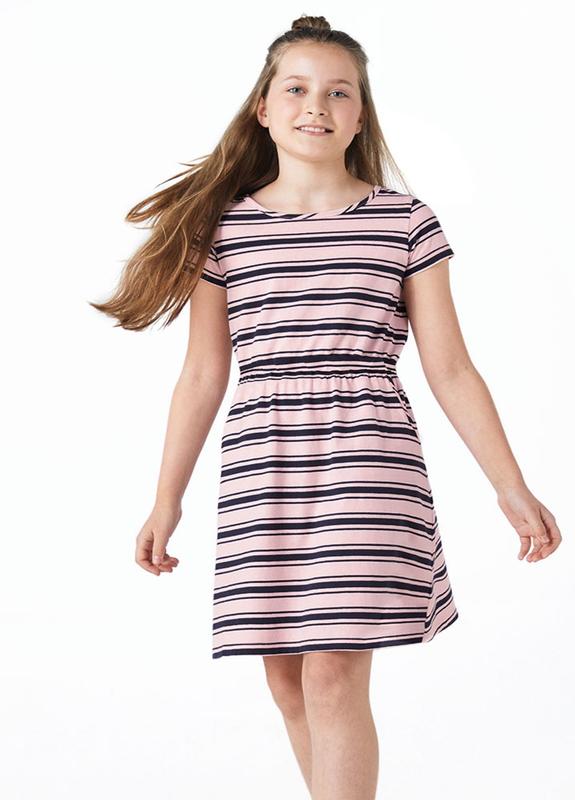 Платье на девочку в полоску бренда Pepperts. Круглый вырез горловины, в талии резинка, по бокам карманы. Короткие рукава. Естественный комфорт благодаря натуральному хлопку. Легкий и качественный трикотаж. На рост 122-128см возраст 6-8 лет Состав 100% хлопок
