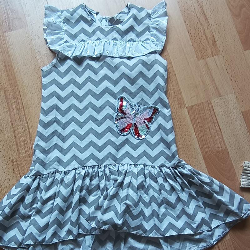 красивое платье, легкое, цвет как на 2-х фото, замеры на фото, удлиненное сзади, выглядит отлично. размер указан на рост 122.