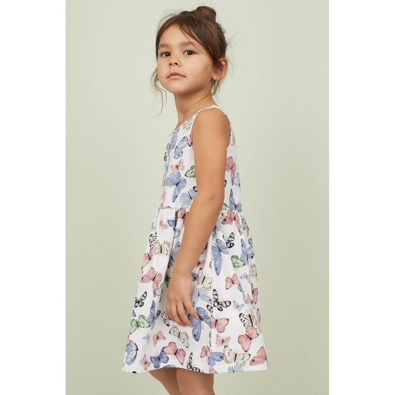 Трикотажное платье без рукавов из хлопкового трикотажа с принтом. Отрезная талия со сборкой и расклешенная юбка. Белый/Бабочки Размер 2-4 года,рост 98/104 ПОГ- 27-28 см Длина - 49 см Состав Хлопок 100%