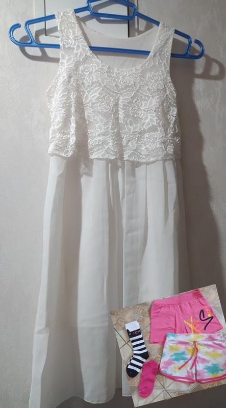 Летнее платье на девочку 7-8 лет, состояние новой. В подарок два шортиков в хорошем состоянии и две пары новых носков.