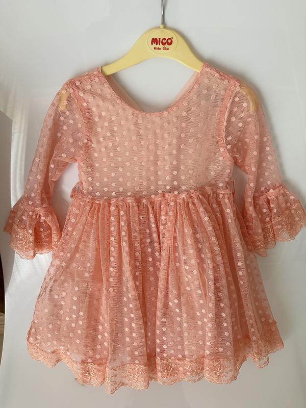 Святкова Сукня для дівчинки 2-3 роки . Довжина від плеча до низу 52 см , ширина в поясі 28 см . В ідеальному стані, на поясі є петлі для поясу ( в комплекті йде атласна стрічка) . Зсередини підклад. В міру пишне. Колір персик.