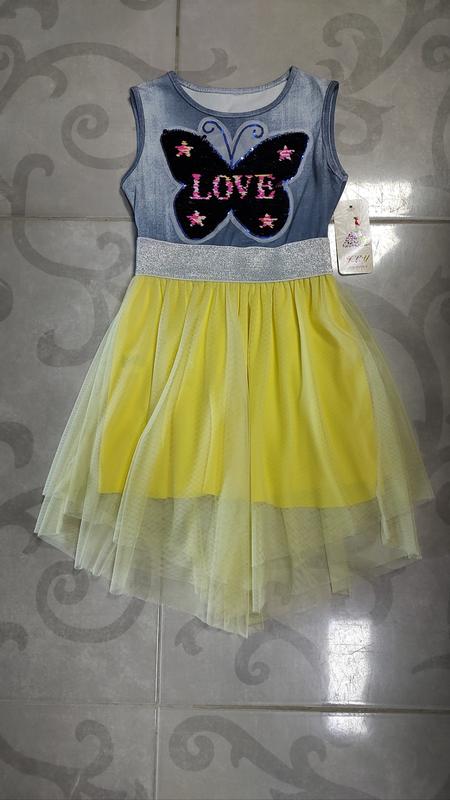 Платье на девочку верх под джинс, низ нежно желтого цвета фатин, по бирке 8 лет, но маломерит на 6-7 лет (116/122 р.), длина до конца фатина 70 см, ширина между подпашками 33 см, пояс на резинке 27 см (тянется), производства Италия