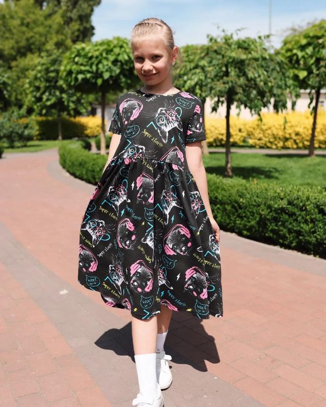 Легкое летнее платье черная с котиками, собачками, платье миди подростковое, сарафан