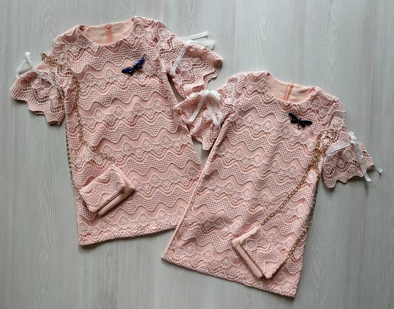 Гарна сукня з сумочкою - трикотаж + мереживо - на спинці блискавка - спинка без мережива - брошку можна зняти Розміри в наявності: 98см. 2шт 104см. 2шт 110см. 2шт 116см. 2шт Ціна: 645грн Звміри: допустима похибка ( +-2см.) Довжина/ширина 98см. 49/29 104см. 51/30 110см. 54/31 116см. 57/32