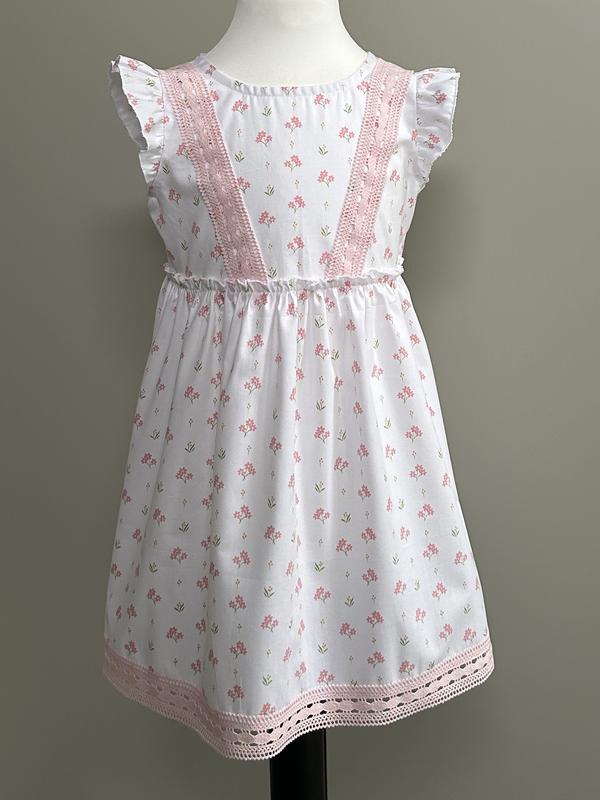 Нежное платье на девочку 4-5 лет. Материал - хлопок 100%. Длина платья - 61 см, пог - 32 см, длина сверху до юбки - 24 см, длина юбки - 37 см, по плечам - 26 см.