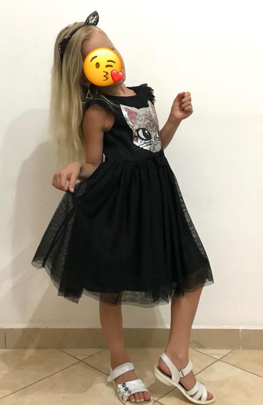 Платье черный котик, пайетки очень красивые. Н&М. Рост 110-116 Любимое нарядное платье моей дочки, одевали в 5 лет 110 см и до 8 лет 130 см. Длина 65, под руками 31, талия 30 Очень пышное, красивое, нарядное., состояние идеален, как новое. Очень легкое в уходе не нужно гладить.