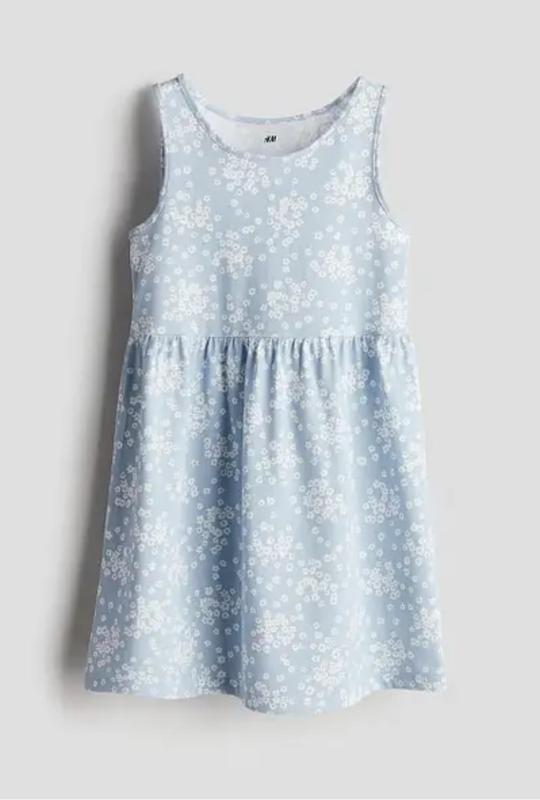 Платье без рукавов из узорчатого хлопкового трикотажа со собранным швом на талии и расклешенной юбкой. Тканина: 100% бавовна. Цвет: голубой. Размер в наличии на рост 92, 98/104, 110/116, 122/128, 134/140см